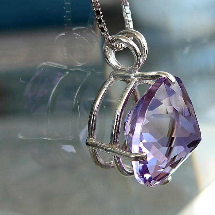 This luminous richly hued and resonant Rose de France Amethyst Radiant Heart pendant is truly a stunning piece! It is so clear you can see light reflected & refracted in its surface. It is set into a sterling silver basket setting which allows the stone to breath, and hangs on its sterling silver chain right on the thymus between the throat and the heart chakras, offering protection to the whole body resonating through the compassionate heart.