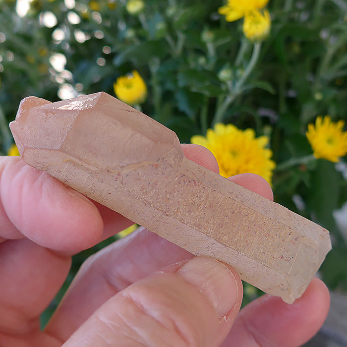 You'll notice that this beautiful Madagascar scepter is highly translucent with virtually no internal inclusions. This quartz scepter displays a peach coloration indicative of amblygonite, which coats the surface of the scepter.