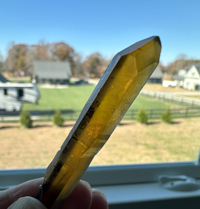 This highly translucent, 43.55 carat, 2.5" long Congo Citrine Diamond Window Pane Wand represents a unique mineralogical find, a true collector's item.