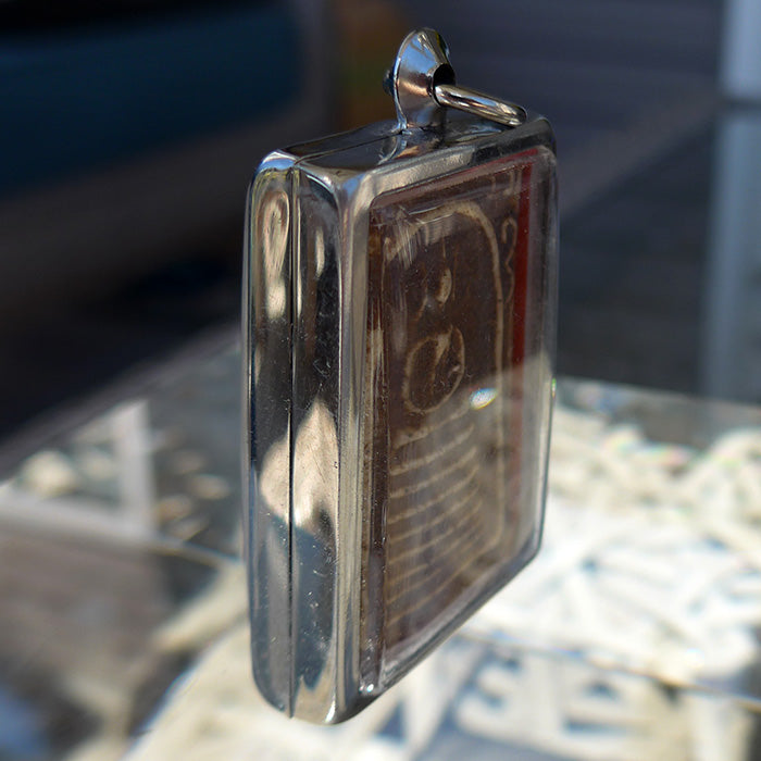 This magnificent museum-quality sterling silver hand-carved Vintage Phra Somdej  Wat Rakhang Buddha Amulet from Thailand functions as a powerful altar/pendant, weighing 20 grams or .7 ounces, and standing 2 inches tall. It comes complete with an 18 inch sterling silver chain in its own velveteen jewelry box for safekeeping.